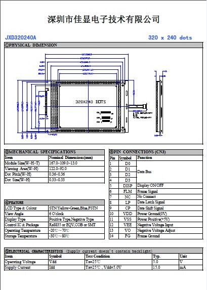 圖形點陣液晶模塊JXD320240A 無控+M FSTN 白光正顯